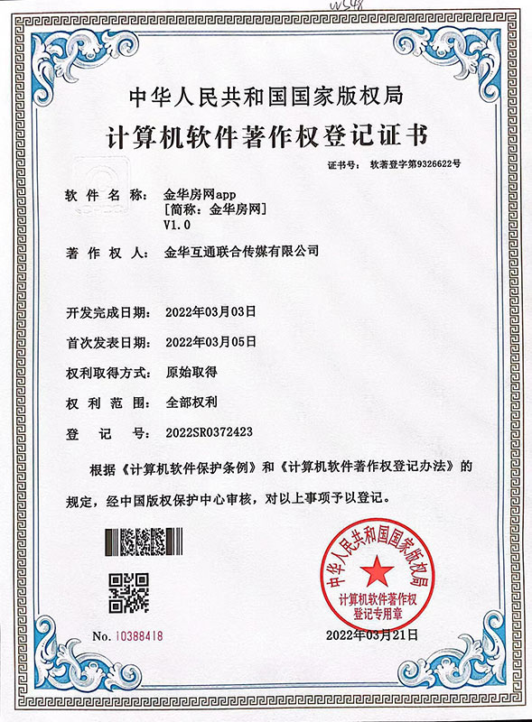 金华房网APP国家版权局计算机软件著作权登记证书